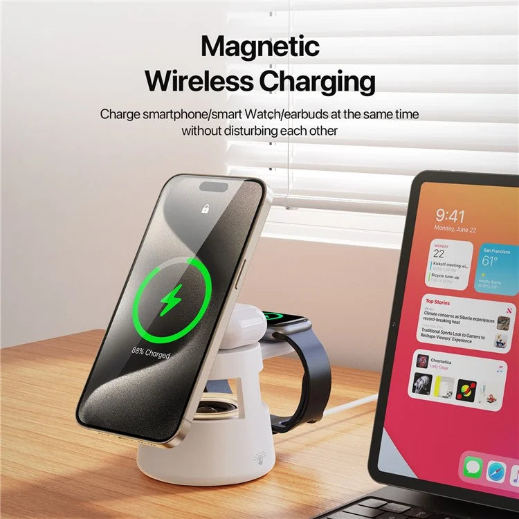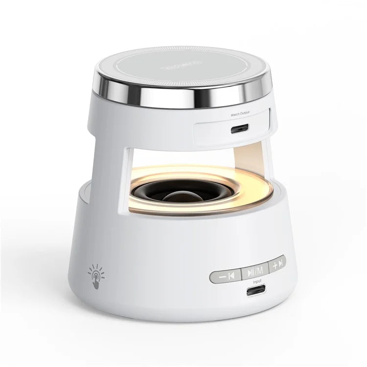 O carregador wireless W23 é um carregador 5 em 1 que combina funcionalidade e design compacto. Com suporte para carregamento sem fios magnético, coluna Bluetooth, luz ambiente, suporte para telemóvel e iluminação noturna, é o acessório perfeito para manter o seu espaço organizado e moderno.