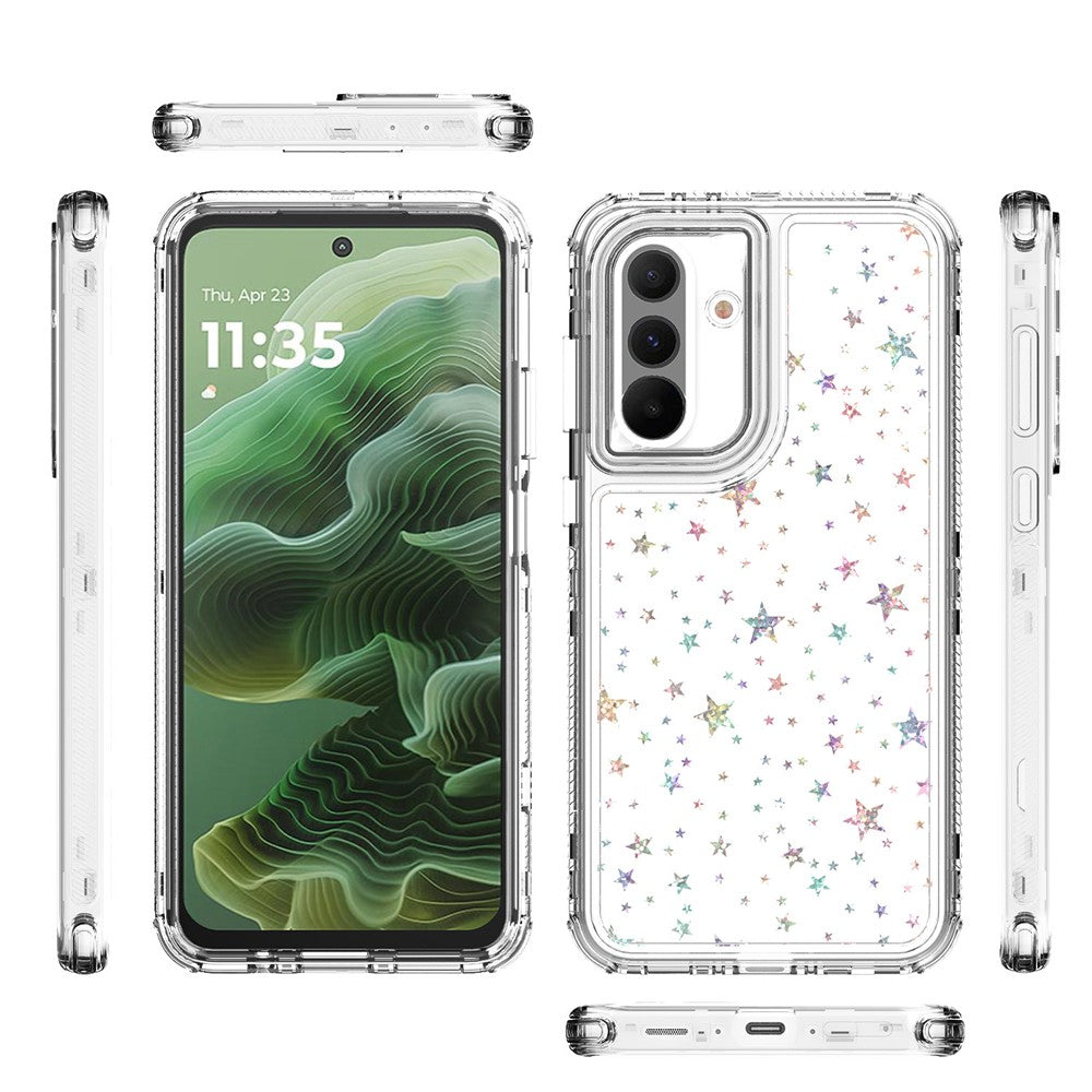 A Capa StarClear Laser destaca-se pelo design transparente com estrelas em efeito laser, combinando um visual criativo com proteção eficaz. A estrutura híbrida em TPU e acrílico garante leveza, resistência e encaixe perfeito no seu smartphone.