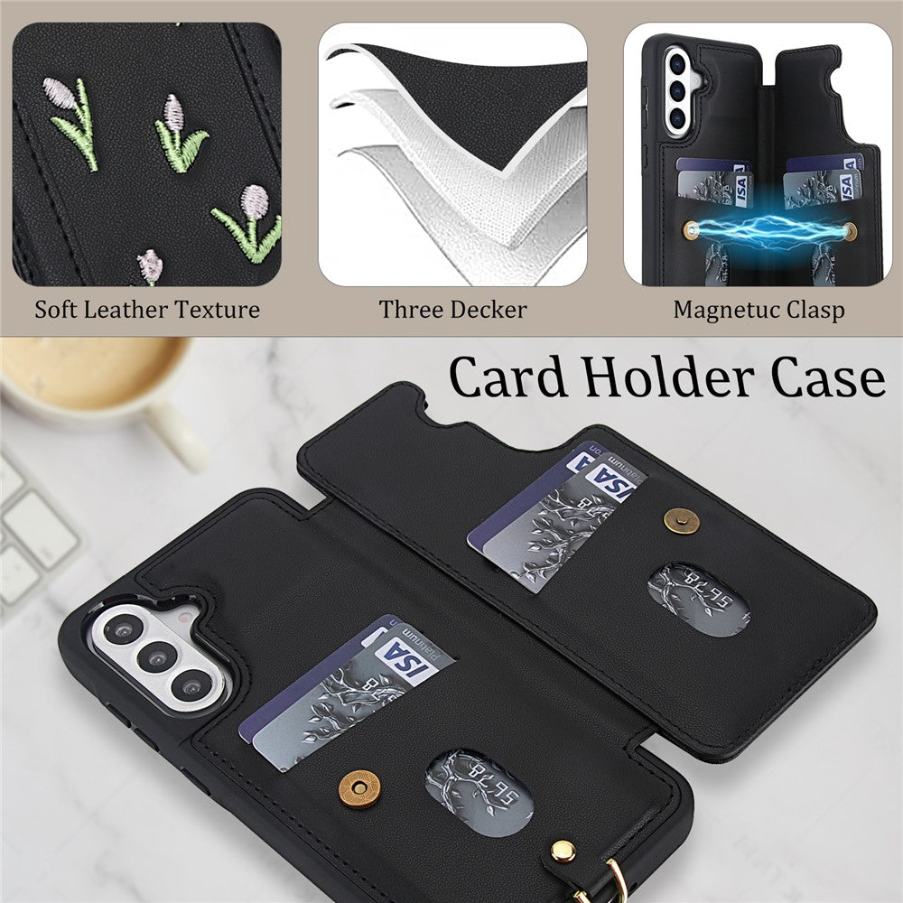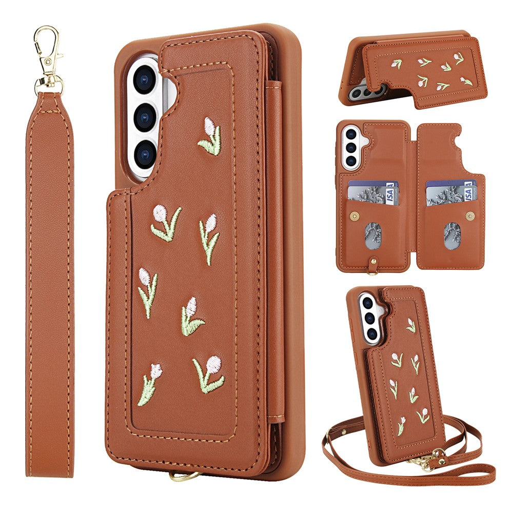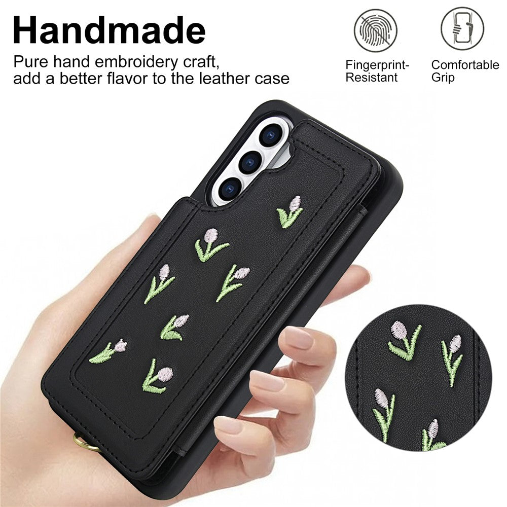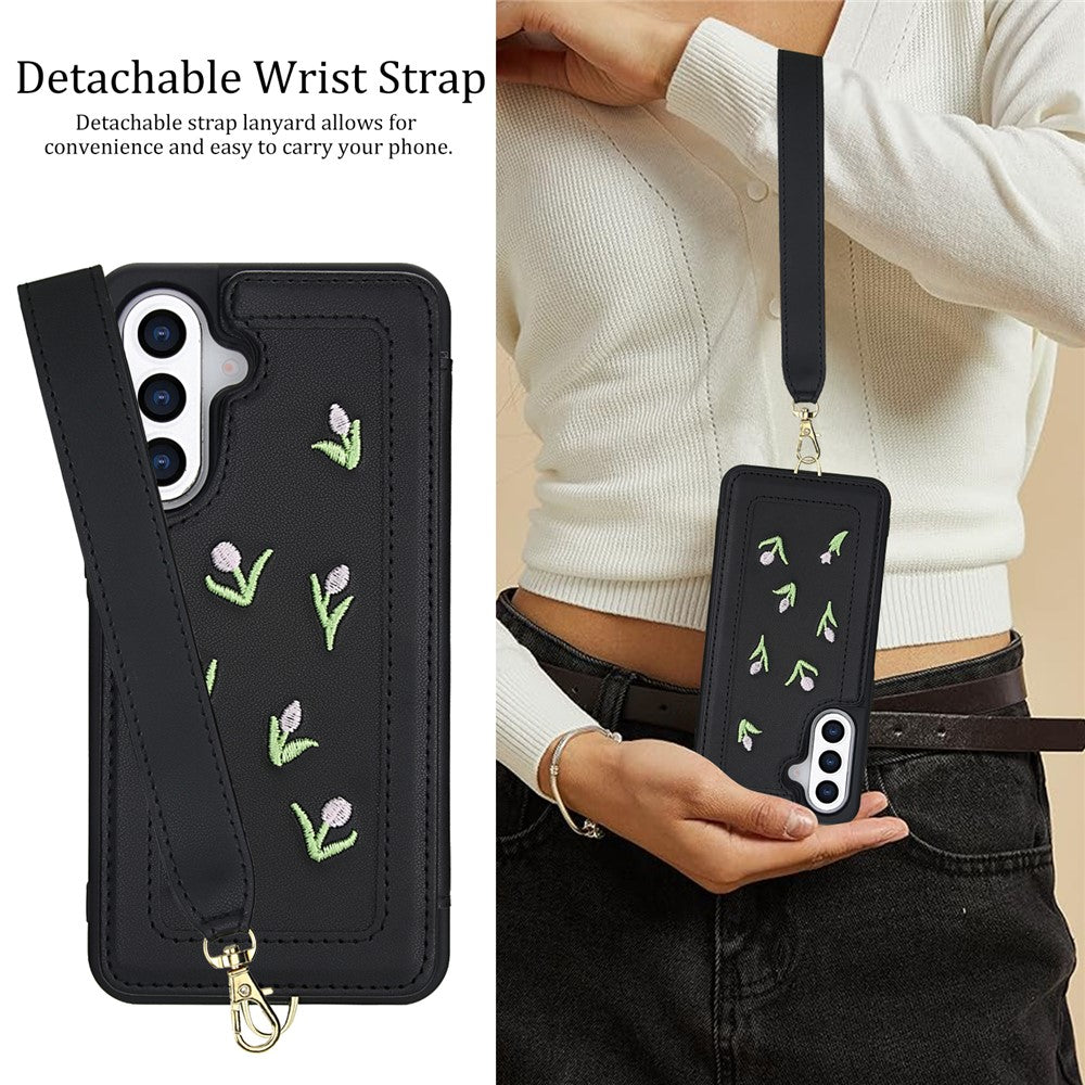 A Capa TulipStrap alia estilo delicado e funcionalidade. O seu bordado de tulipas na parte traseira destaca-se num acabamento em pele sintética premium, enquanto o porta-cartões e as alças — de ombro e de pulso — garantem versatilidade e segurança no uso diário.